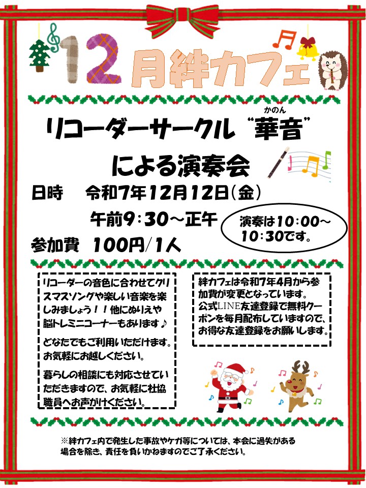 令和7年12月の絆カフェは12日(金)午前9時30分~正午です。