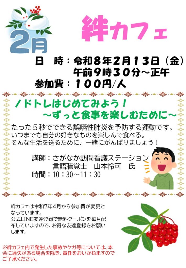 令和8年2月の絆カフェは13日(金)午前9時30分~正午です。
